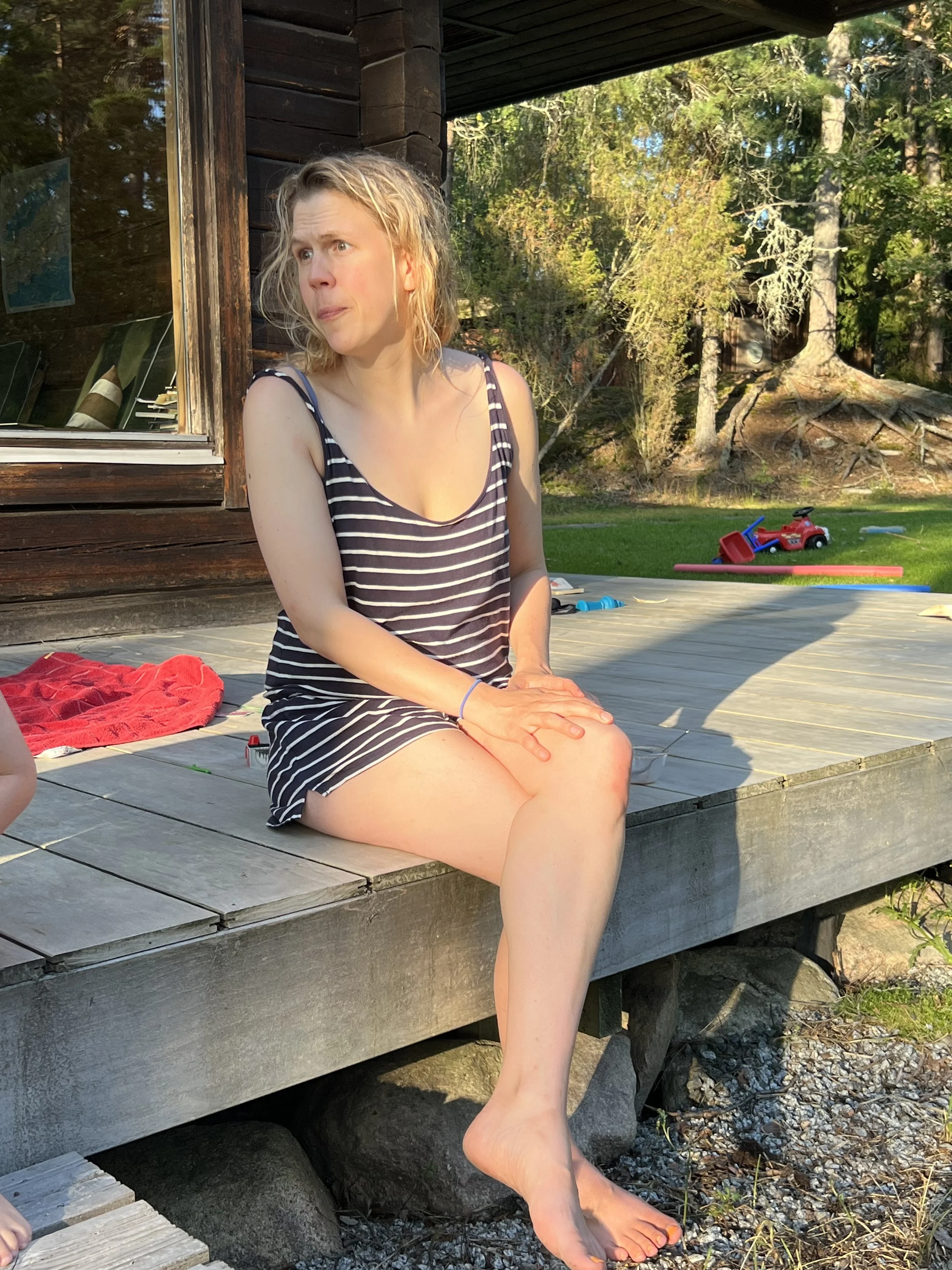 Tänään uitiin Äbän kanssa Kyliksestä meidän rantaan, vesi oli linnunmaitoa, 26 astetta. Metsätie on täynnä mustikkaa, metsämansikkaa ja vadelmaa, myös kantarelleja voi jo poimia. Helle on jatkunut niin monta päivää, että mun pitää iltaisin viilentää huvila ilmanlämpöpumpulla, jotta täällä saa nukuttua.